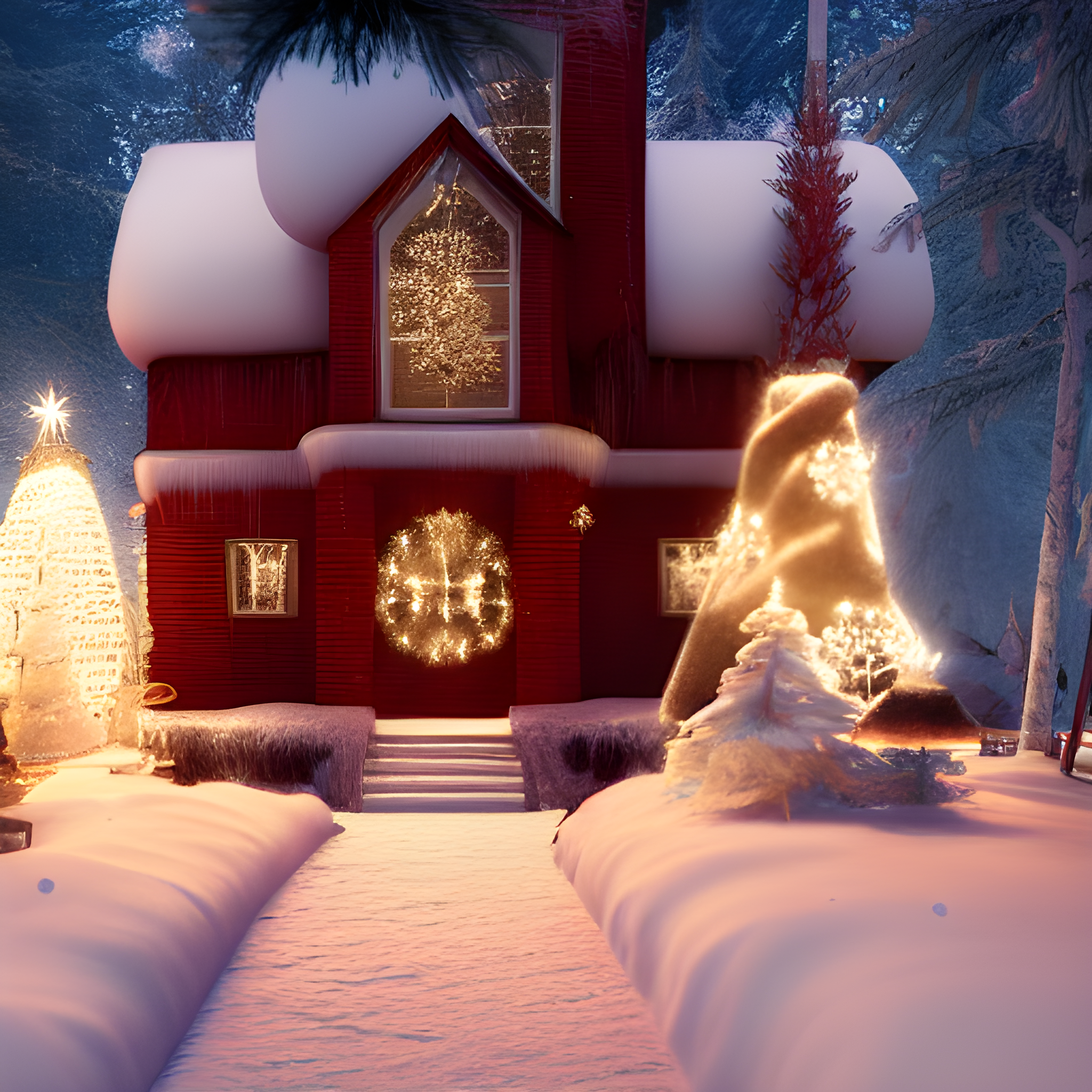 ((iced mystic russian house at the end of a forrest)),christmas light , a bunch of rabbits, snow,