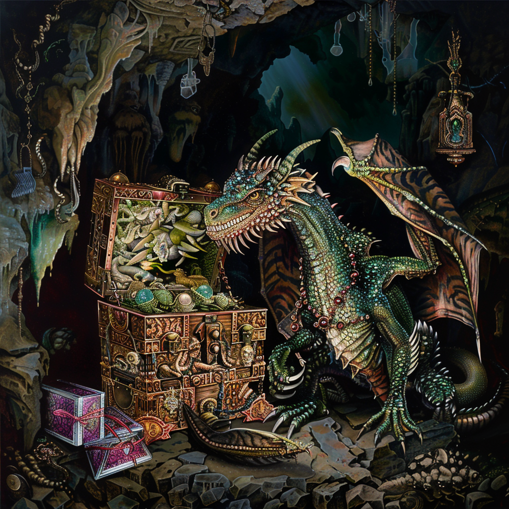 prompt: An old dragon sits next to a richly decorated treasure chest in a cave. hyper-detailed, Electroluminescentwire